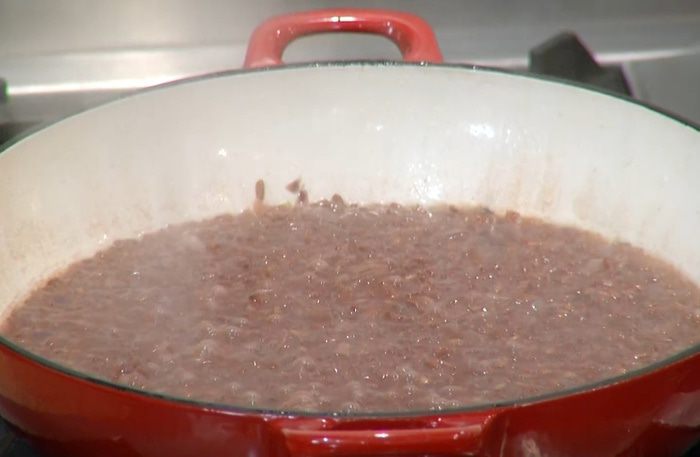 Когда рис станет блестящим, влить горячий овощной бульон, так чтобы рис был покрыт жидкостью.