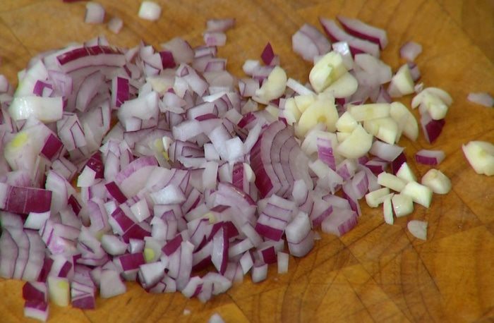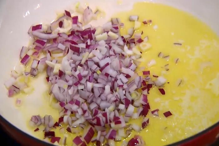 Разогреть в тяжелой сковороде сливочное и оливковое масло и обжарить лук и чеснок.
