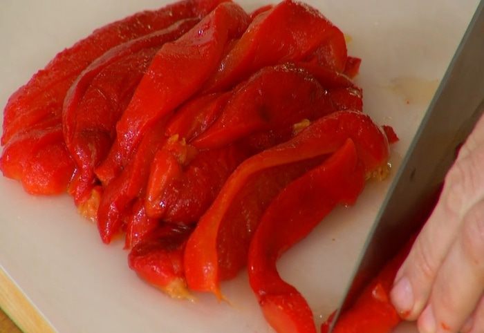 Сладкий перец запечь в разогретой духовке, поместить в целлофановый пакет и плотно закрыть. Когда перец пропотеет, удалить семена и кожицу.