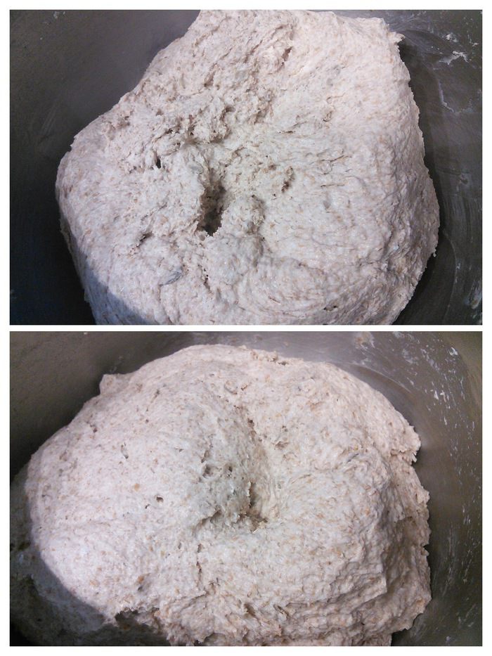 В день выпечки смешаем опару с остальными ингредиентами основного теста в комбайне первые 10 мин на малой скорости, затем увеличиваем скорость до средней и вымешиваем ещё 5 минут до гладкого, эластичного теста. Дайте тесту пол часа отдохнуть.