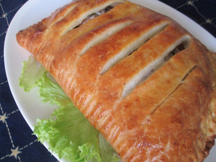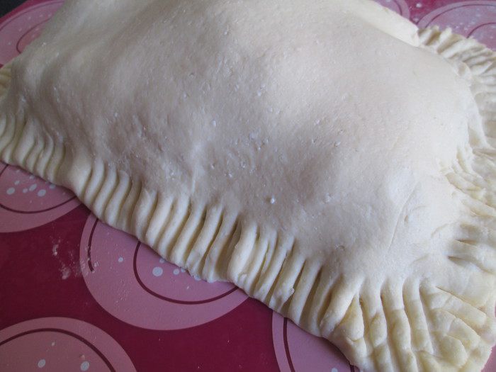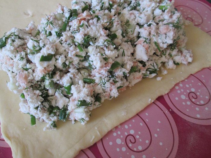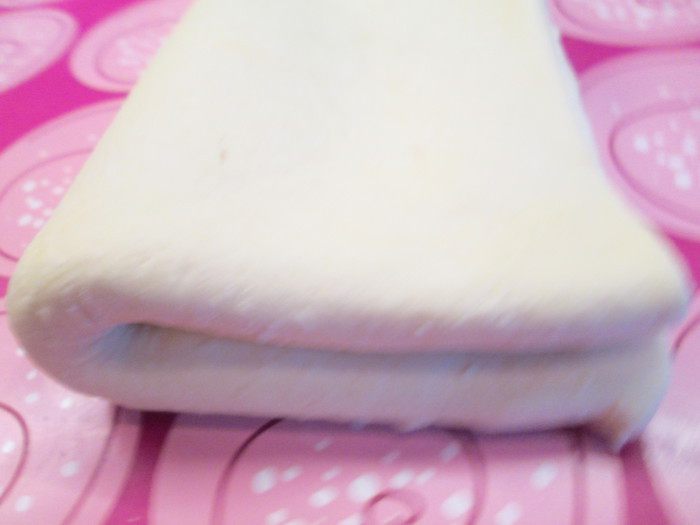 Утром вынимаем из холодильника тесто, даем согреться и раскатываем в пласт 40х50. Затем тесто складываем: сначала втрое — раскатываем, и наконец, вчетверо.
