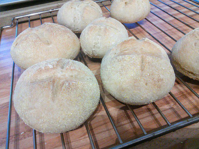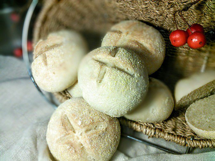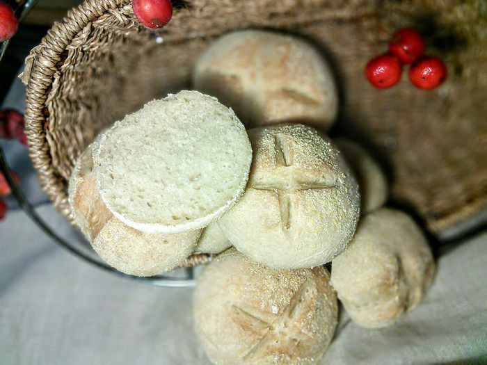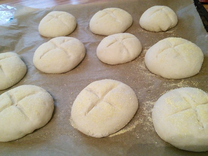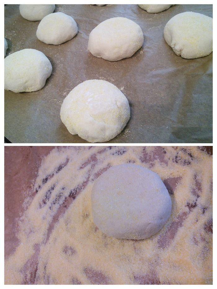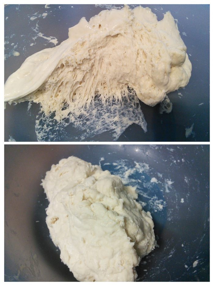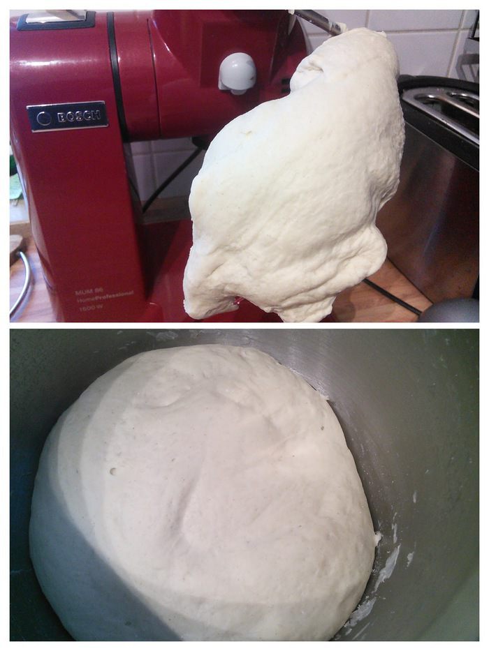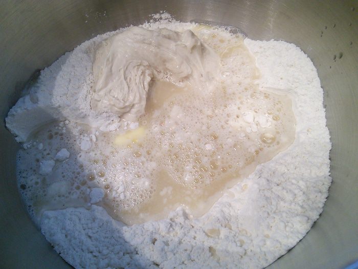 В день выпечки смешать в комбайне опару с остальными ингредиентами основного теста (дрожжи растворите в тёплой воде, в этой же воде масло комнатной температуры) первые 5 минут на малых оборотах, затем увеличить скорость до средней и вымешивайте ещё 5 минут. Тесто получается плотное, эластичное, не липнет к рукам.