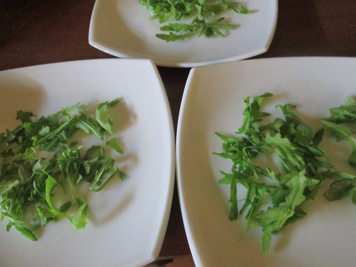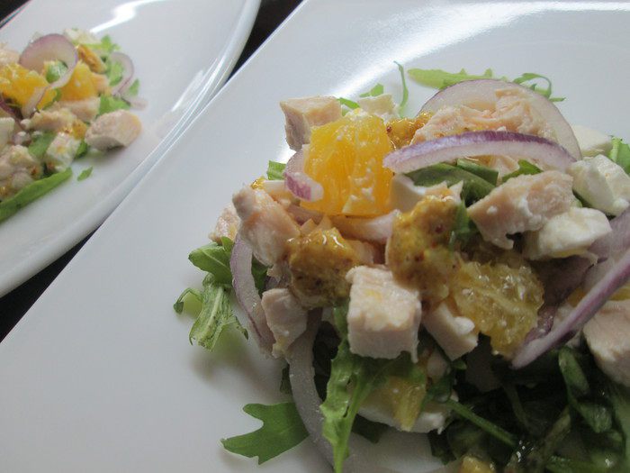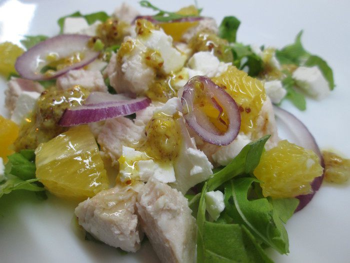 Нарезаем кусочками куриную грудку (можно не только вареную, а и жаренную), такими же кусочками режем творожный сыр, апельсин — он должен быть без белых пленок. Лук режем кольцами или полукольцами. Укладываем на листья салата сначала кусочки курицы, затем сыра, лука и апельсина.