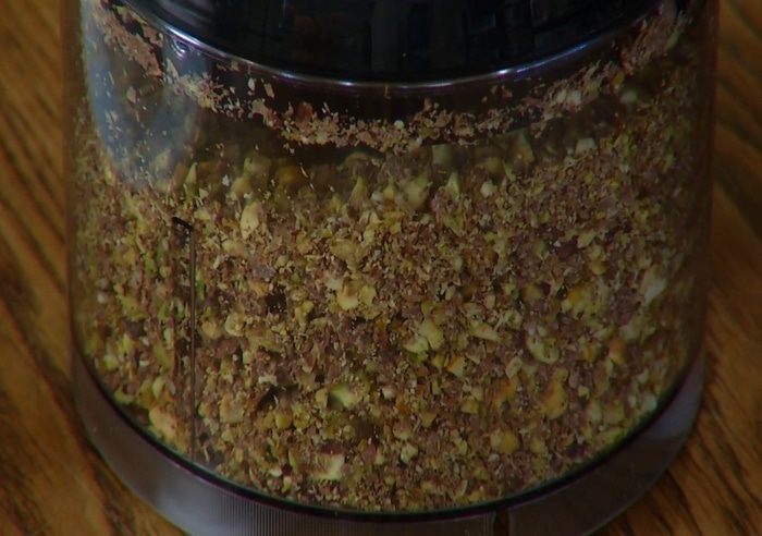 Большую часть фисташек (немного оставить для украшения) и 75 г молочного шоколада измельчить в блендере в мелкую крошку.