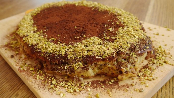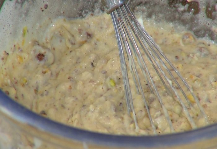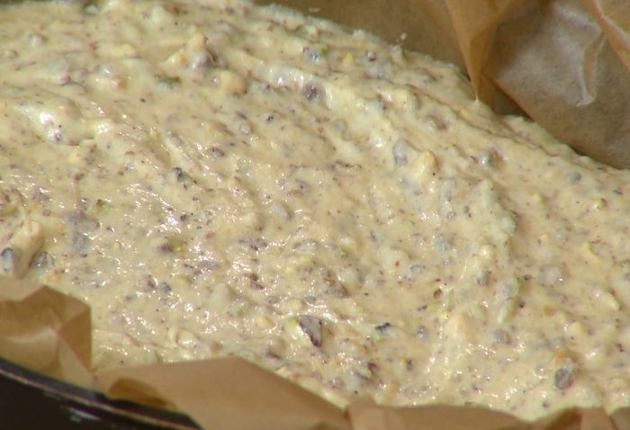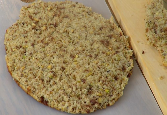 Оставшиеся фисташки измельчить в блендере и посыпать пирог по краям.