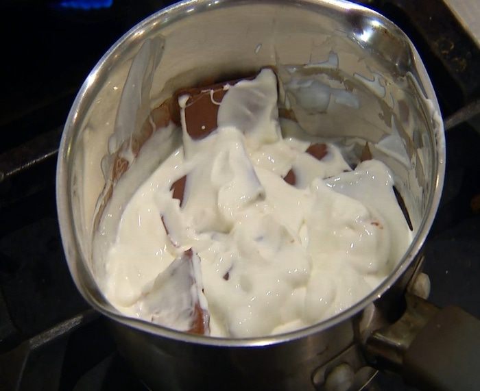 Приготовить крем: в небольшой кастрюле соединить шоколад со сметаной и растопить все на медленном огне, периодически помешивая.
