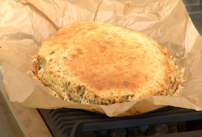Готовый пирог остудить на решетке, затем разрезать вдоль пополам.
