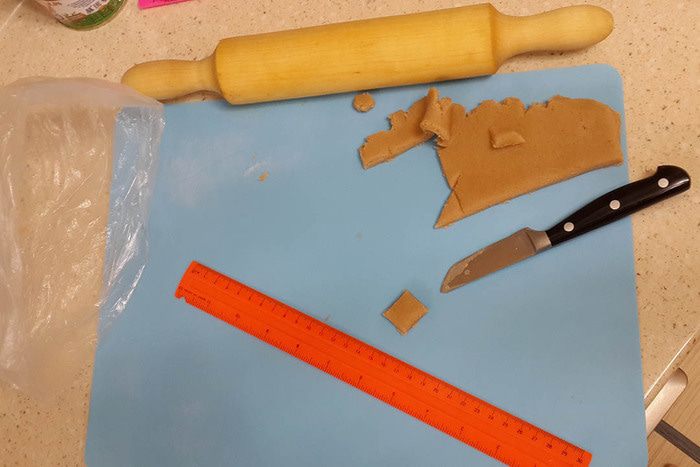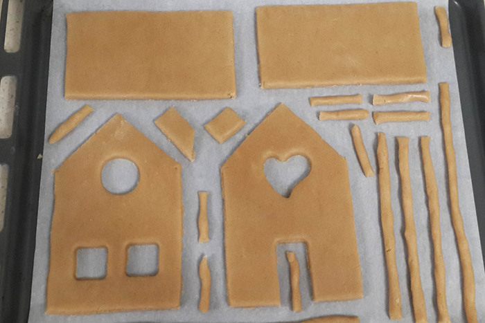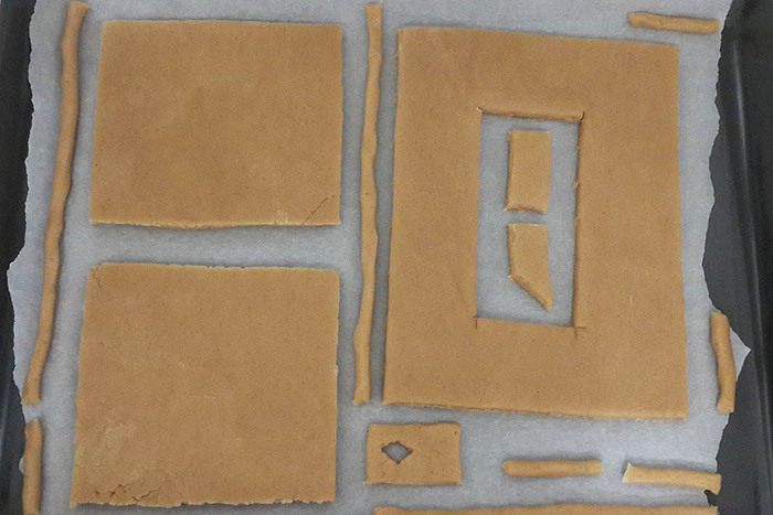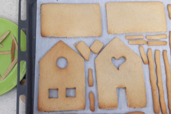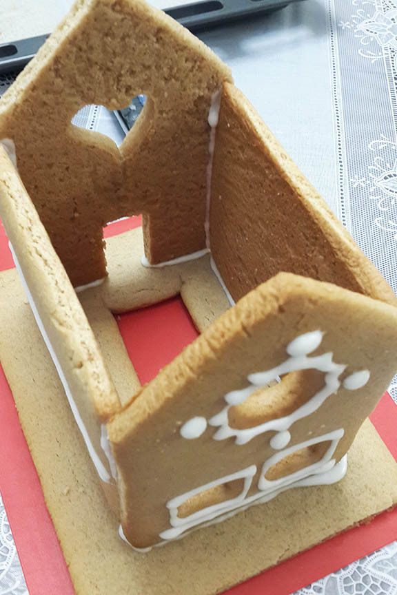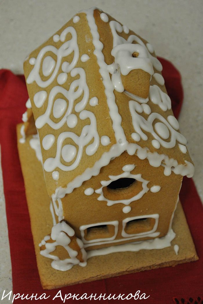 Сначала раскрасить все стены (остальное можно раскрасить, пока стены будут схватываться). Подождать минут 10. На подставку сначала поставить одну стену, к ней прилепить глазурью вторую стенку (к подставке тоже) и так, по очереди. Каждую стену я держала минут 5-7 (из них всего 1 минутку руками придерживала, остальное время потом само застывало) для надежности. Затем крышу. Потом детали, в самом конце трубу.