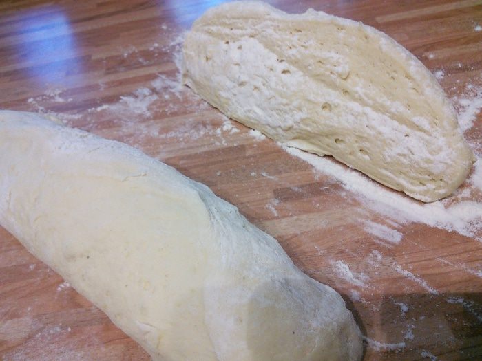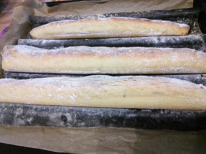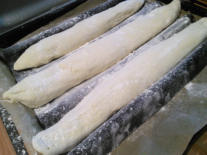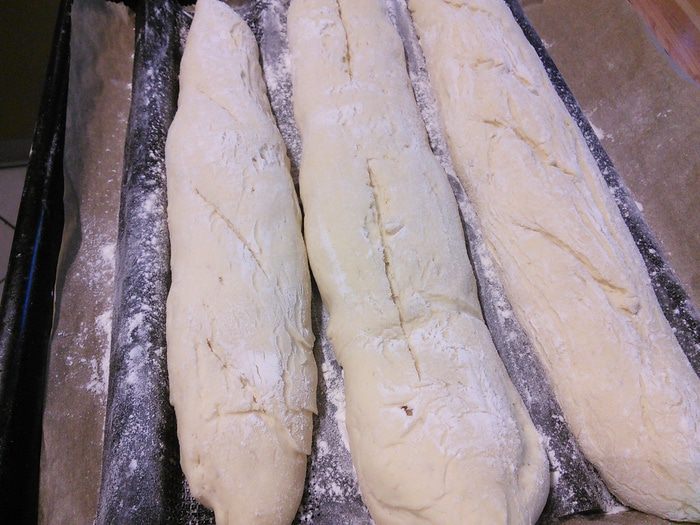 Сделать надрезы, выпекать при 250°С в заранее разогретой духовке около 25 минут с большим количеством пара. Так было в оригинальном рецепте. Мои багеты при выпекании в этих условиях подрумянились сверху, а с низу и по бокам остались бледноватыми, естественно и середина не допеклась. Поэтому рекомендую выпекать при 230°С, увеличив время. Ну и тест на сухую палочку!