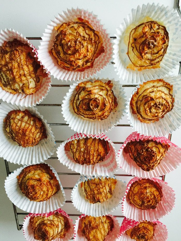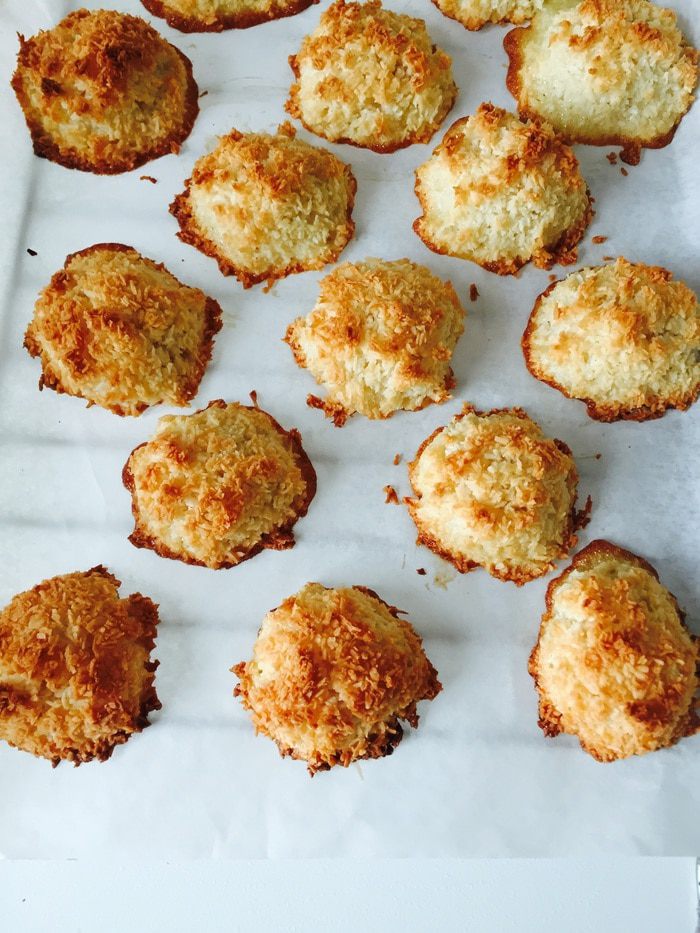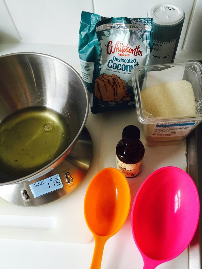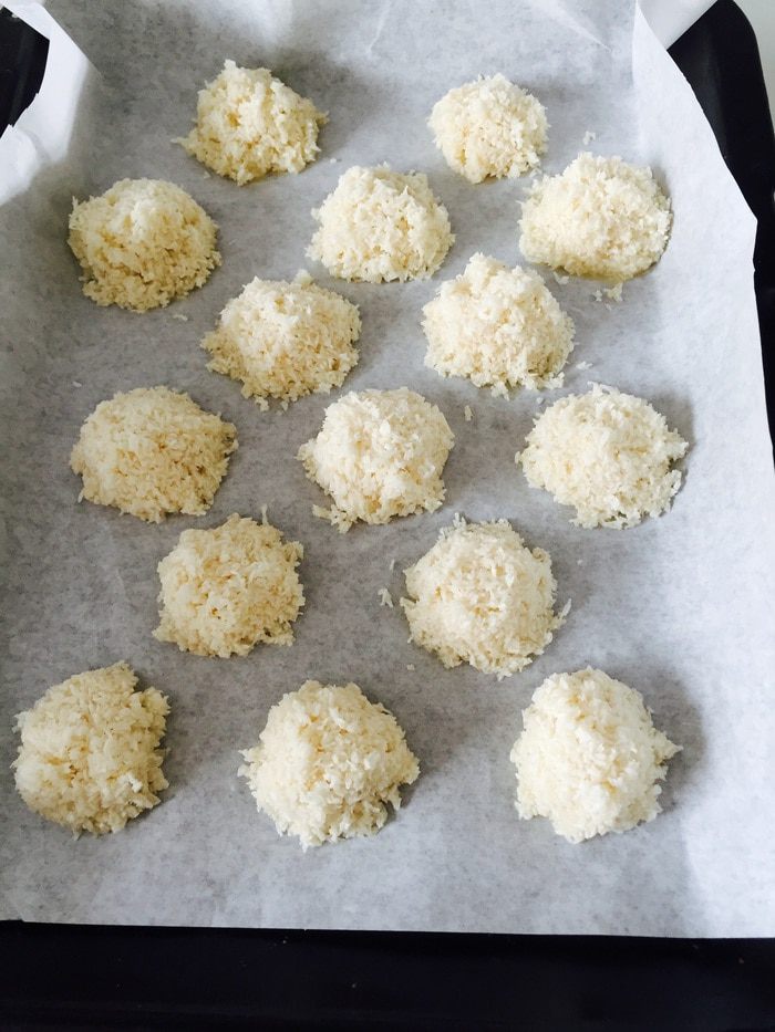 В принципе можно начать и закончить все на шаге 1! Это главное отличие от макарон! Духовку ставим на 170°С, застилаем противень пергаментом, немного смазываем его маслом без запаха. Смешиваем белки, сахар и соль (просто смешиваем, не взбиваем — еще одно отличие), потом кокосовую стружку.