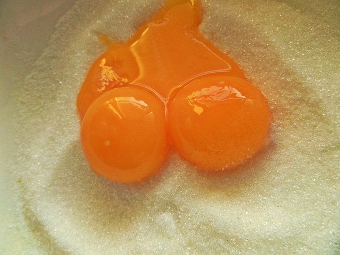 Отделяем желтки от белка. Один белок отдельно убираем в холодильник на "шапочку".