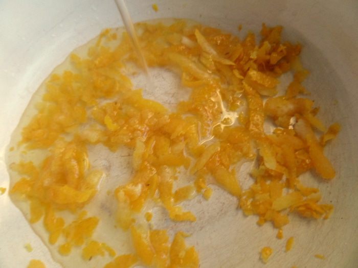 Отдельно в миску натираем цедру лимона, заливаем водой и ставим на огонь выпариваться.