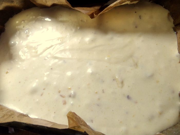 Застилаем форму пергаментом, смазываем кисточкой и выливаем всё тесто.