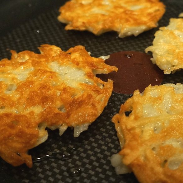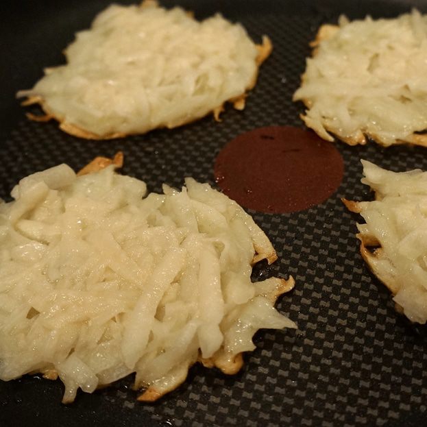 Наливаем немного масла на сковороду, где жарился бекон, и начинаем готовить драники. Выкладываем смесь столовой ложкой и прижимаем ее, формируя тонкий круглый оладушек.