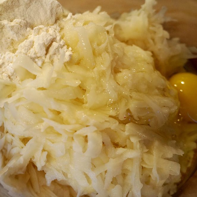 Добавляем в миску с картофелем яйцо и муку. Важно не солить на этом этапе, иначе драники не получатся хрустящими.