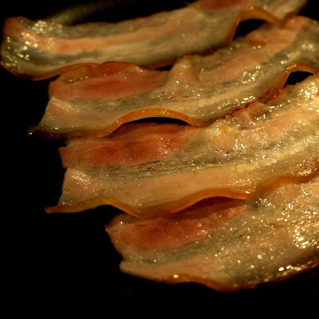 Через 5–7 минут аккуратно переворачиваем и обжариваем с другой стороны. Вот теперь можно немного поперчить и посолить, но не забывайте, что бекон тоже придаст блюду солоноватый вкус.
