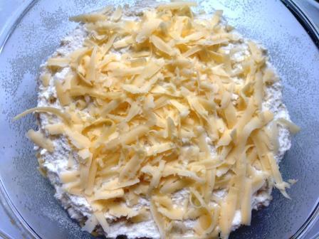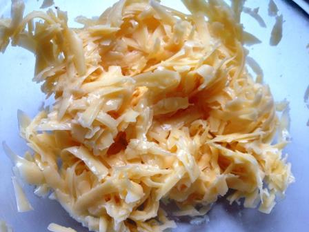 Сыр натереть на терке и примерно 2/3 из общей массы смешать с белком.
