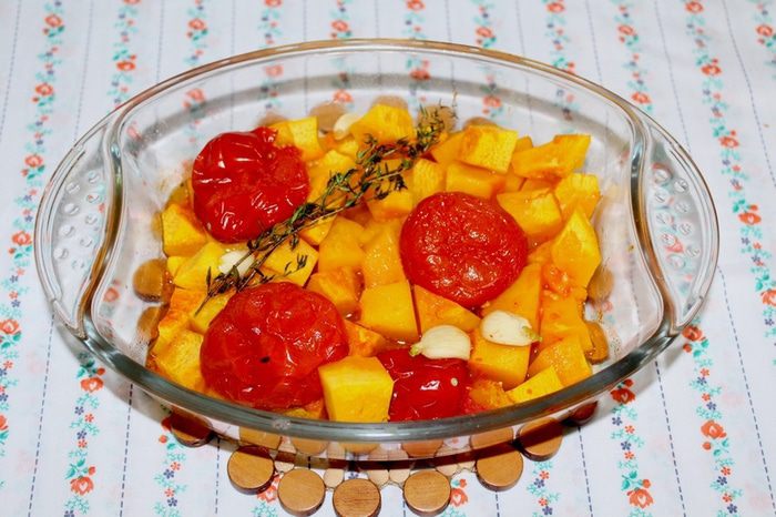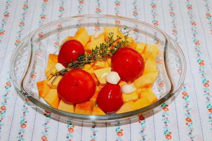 Тыкву очистить и нарезать на кусочки, положить в форму, туда же отправить помидоры, чеснок и тимьян. Полить все оливковым маслом и отправить в духовку.