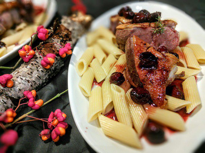 Теперь остается выложить нарезанные утиные грудки на тарелку и полить их вишневым соусом.