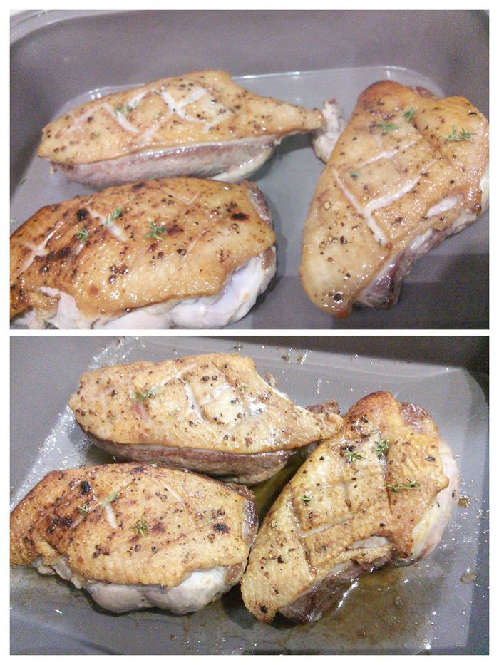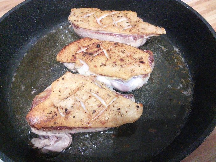 В сухой разогретой сковороде обжарьте утиные грудки, сначала со стороны кожи 5 мин.