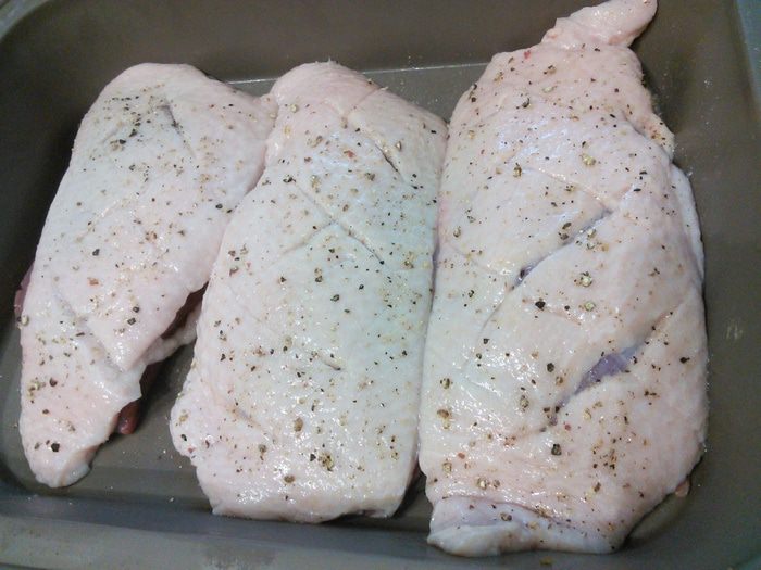 Утиные грудки помойте, острым ножом сделайте крестообразные надрезы на шкурке, посолите и поперчите.