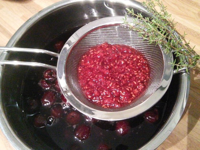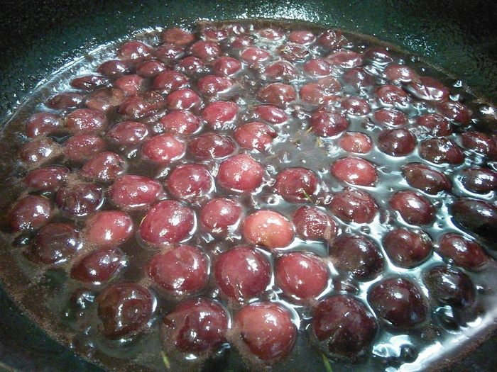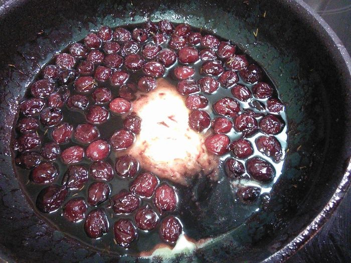 В сотейник выложите вишню, влейте вино, добавьте тимьян, желе (смородиновое или малиновое), доведите до кипения, снимите с огня. Нам необходимо, чтобы вишня отдала соусу свой сок.