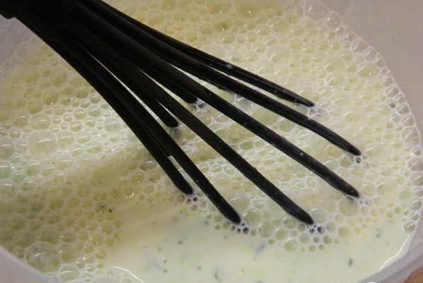 В молоко добавить йогурт и сыр с базиликом. Перемешать все венчиком до однородного состояния.