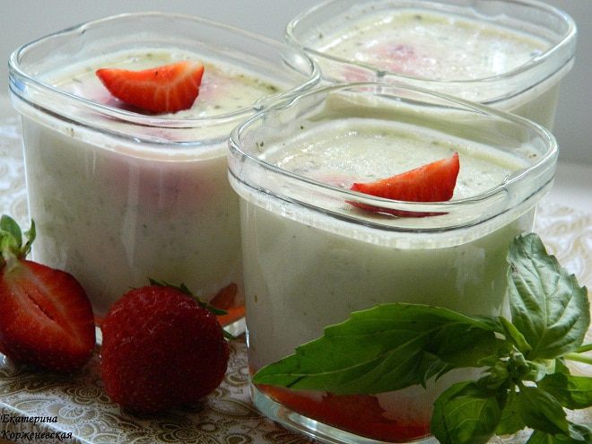 Прекрасно начать день с йогурта, да еще с домашнего! Здесь прекрасно дружат базилик и клубника. Ценители изысканной кухни оценят по достоинству! Вкусно, полезно и никаких консервантов!