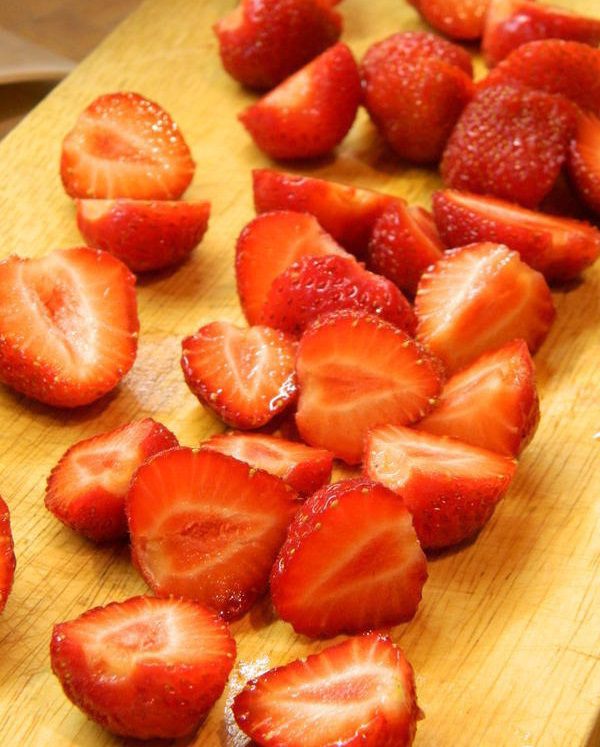 Клубнику помыть, удалить зеленые хвостики и разрезать на 2 части.