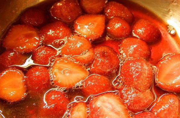 В сотейник сложить клубнику, сахар и 1 ст. л. воды. Тушить пока она не станет мягкой и не покроется сахарным сиропом. Остудить.