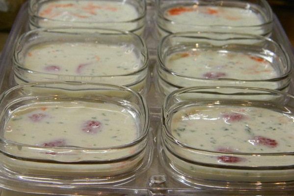 Включить йогуртницу в сеть и поставить йогурт готовиться на 8 часов. По истечению времени закрыть баночки крышками и убрать в холодильник. Чем дольше он стоит, тем гуще он становится.