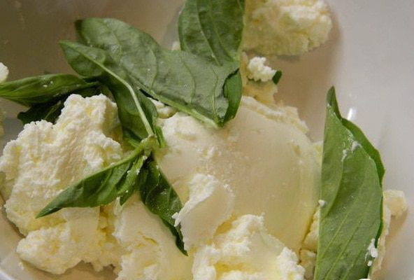В миску выложить сыр комнатной температуры и листики базилика.