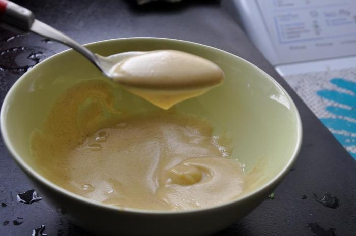 Готовим заправку, которая называется Винегрет. Кстати, во Франции все салаты заправляют только этим соусом. Количество ингредиентов указала примерное, делайте по своему вкусу. Кто-то любит больше горчицы, кто-то больше уксуса... В общем, выводите свой вариант. Я указала свой, надеюсь, вам понравится:) Смешиваем оливковое (или подсолнечное) масло, горчицу и уксус, тщательно перемешиваем до единой консистенции как на фото. Советую сначала не весь салат заправлять, а одну порцию. Если вы не планируете весь салат съесть за 1 раз, также рекомендую заправку готовить каждый раз заново.