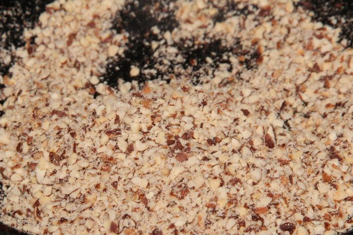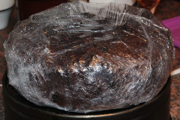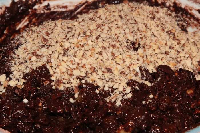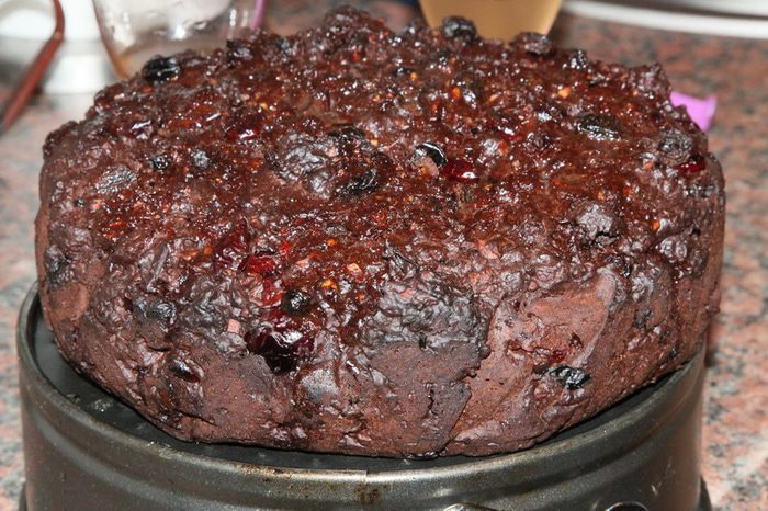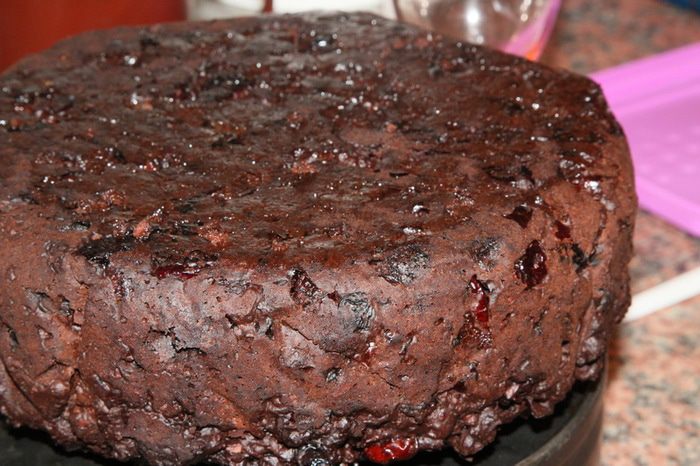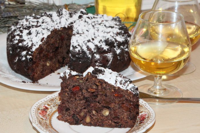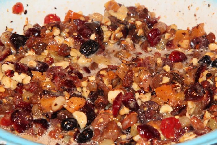 Подготавливаем сухофрукты: чернослив без косточки и курагу нарезаем мелкими кусочками. Изюм, клюкву, вишню моем и просушиваем бумажным полотенцем. С апельсина натираем цедру и выжимаем сок. 120 г очищенного фундука поджариваем на сухой сковороде и крупно рубим ножом. В сотейнике с толстым дном разогреваем масло, добавляем 120 мл рома и сухофрукты, апельсиновый сок, цедру, мед, фундук, ванильный экстракт и сахар. Довести до кипения, уменьшить до минимума нагрев и, осторожно помешивая, дать очень «тихо» покипеть в течение 5-7 минут. Выключить нагрев и отсудить в течение 30 минут (минимум). После того как смесь остынет, добавить взбитые яйца и тщательно вымешать.