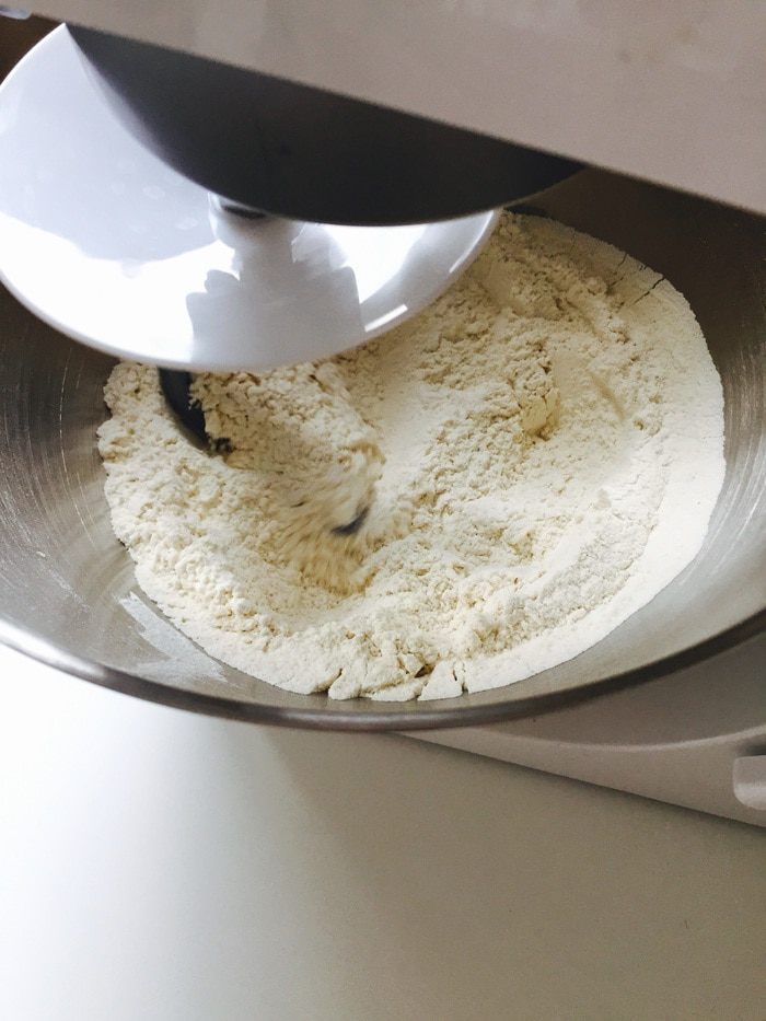 В чашу комбайна просеять муку, перемешать.