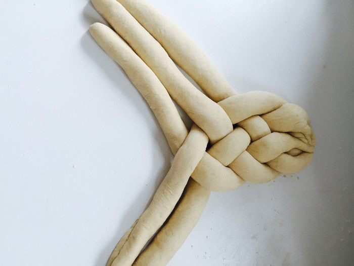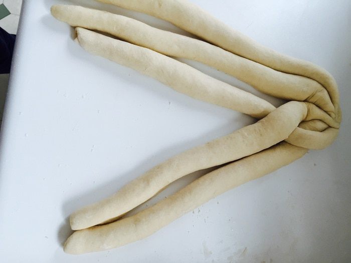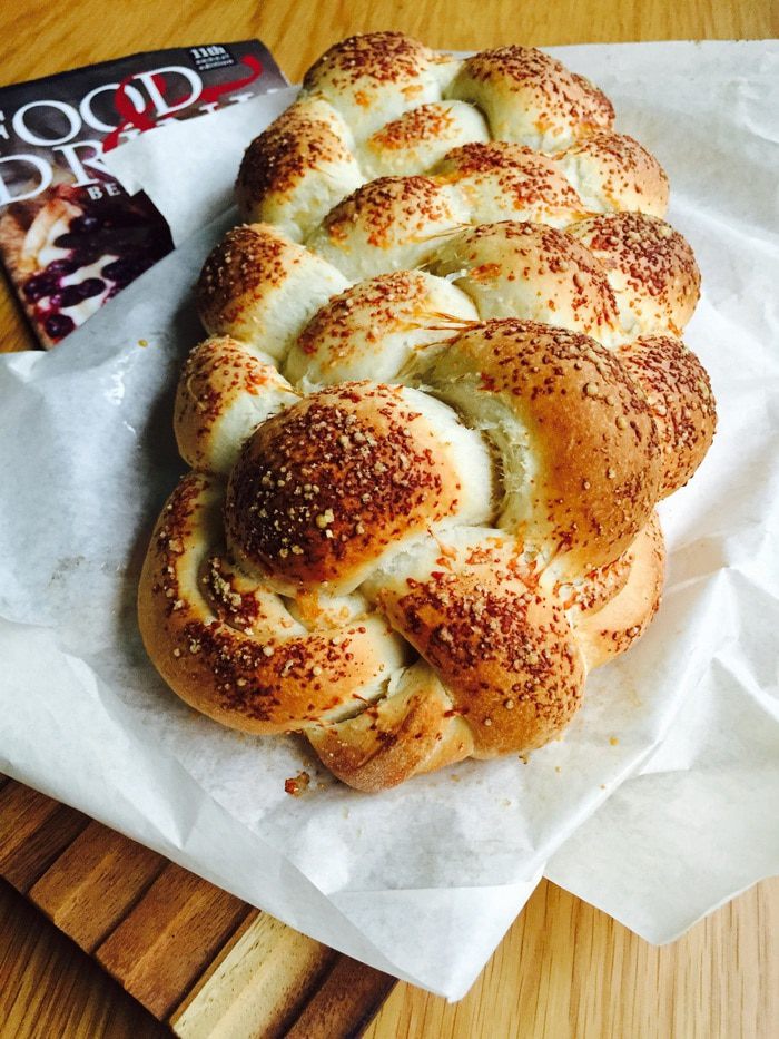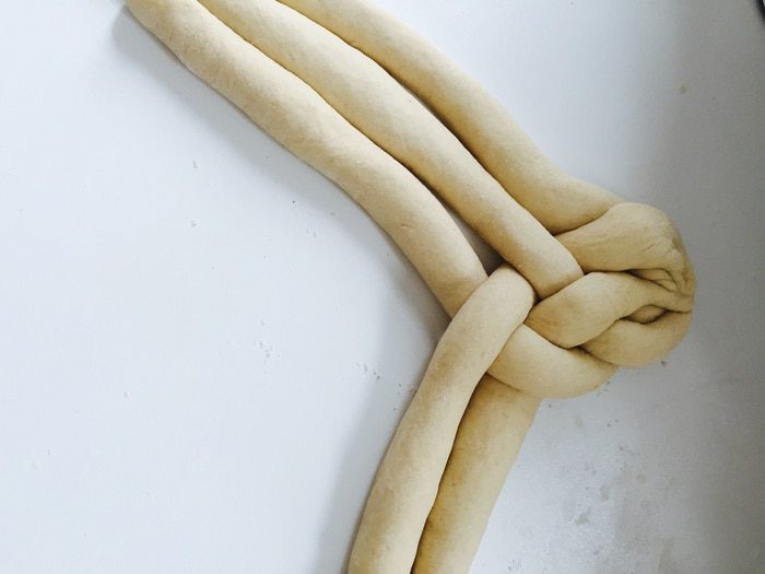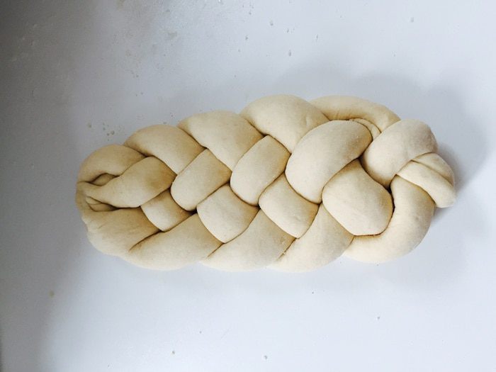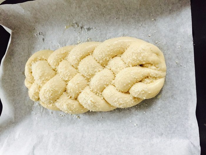 Не забываем хорошо скрепить «конец», подворачивание под косу. Переносим ее на застеленный и смазанный противень. Оставляем на 20 минут.
