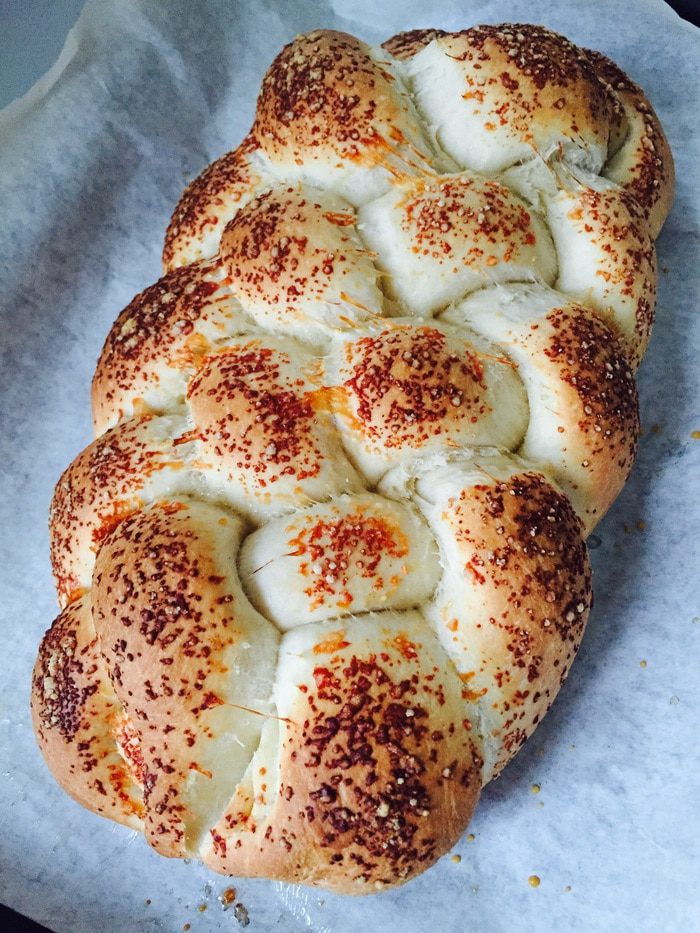 Через это время разогреваем духовку до 190°С. Смазываем еще раз косу маслом, посыпаем пармезаном и в печь на 25 минут.