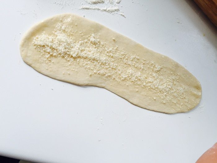 Раскатываем в тонкий узкий пласт толщиной 3-4 мм. Смазываем растопленным сливочным маслом, посыпаем пармезаном.