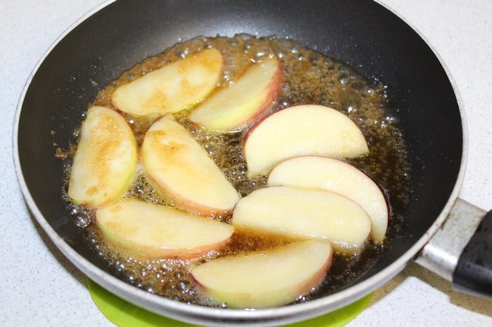 Растопить коричневый сахар в сливочном масле. Когда сахар растает, добавьте яблоки и несколько столовых ложек воды, тушите на небольшом огне 5-8 минут, иногда помешивая, пока яблоки не станут мягкими.