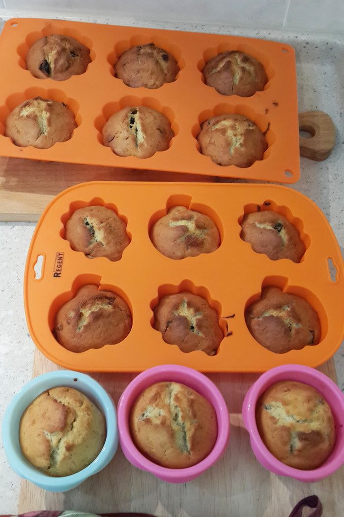 Просеять муку с разрыхлителем. Перемешать. Разложить по формочкам. Выпекать в разогретой до 180°С духовке около 45 минут. Можно подавать горячими к чаю.