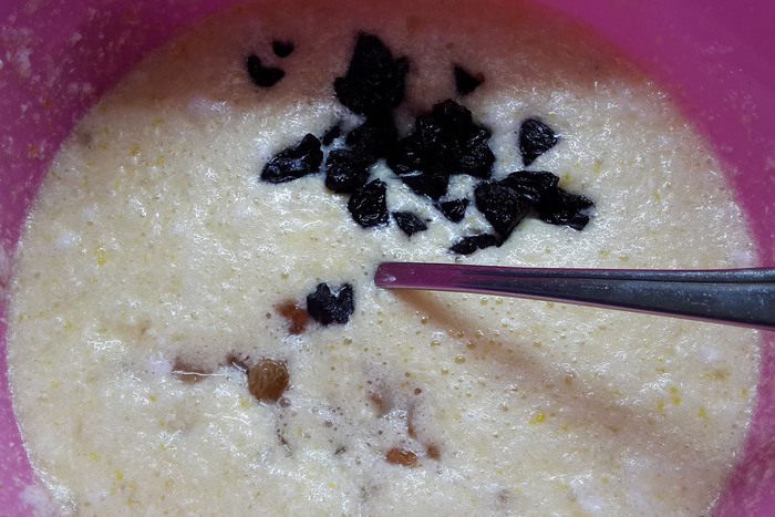 Смешать мягкое масло, белки, желтки и бананы. Добавить изюм и мелкопорезанный чернослив.