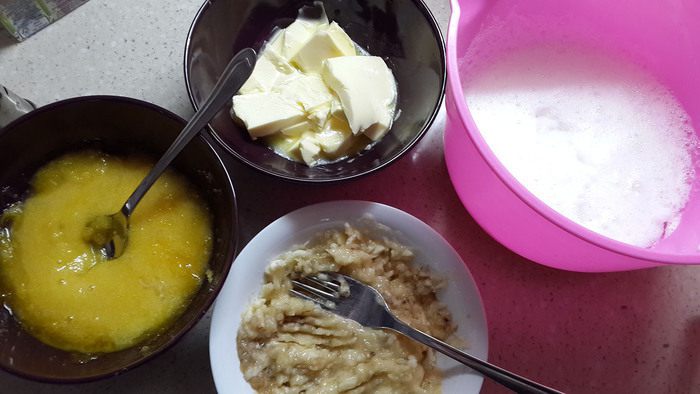 Взбить желтки с половиной сахара до однородной массы. Взбить белки с остальной частью сахара. Мягкие спелые бананы размять вилкой.