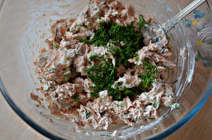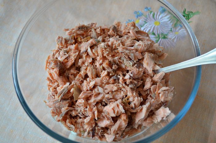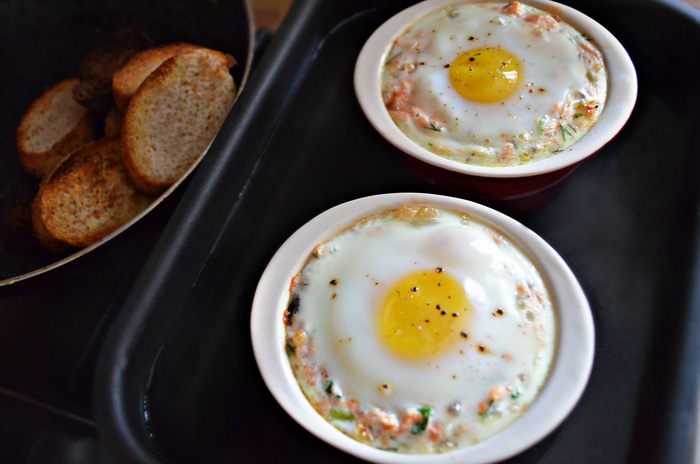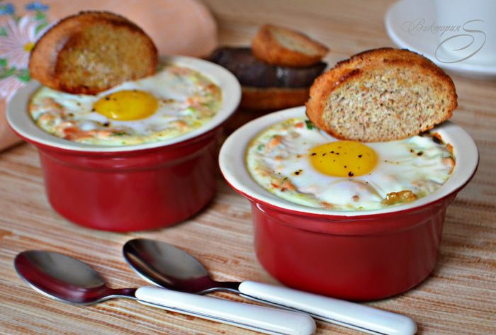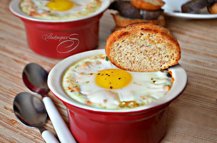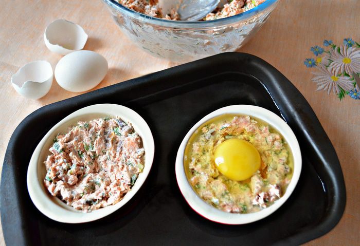 Формочки для запекания смазать растительным маслом и разложить рыбную массу. По центру сделать небольшое углубление, аккуратно, чтобы сохранить желток целым, влить яйцо (всего получилось 3 порции). Сверху немного поперчить. Солить я не стала, поскольку горбуша сама по себе солёная. Но при желании, можно сверху присолить яйцо. Поставить формочки в форму с высокими бортиками и залить на половину их высоты горячей водой. Поставить в разогретую до 180°С духовку на 15 минут.