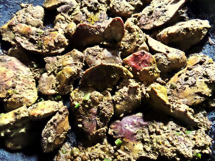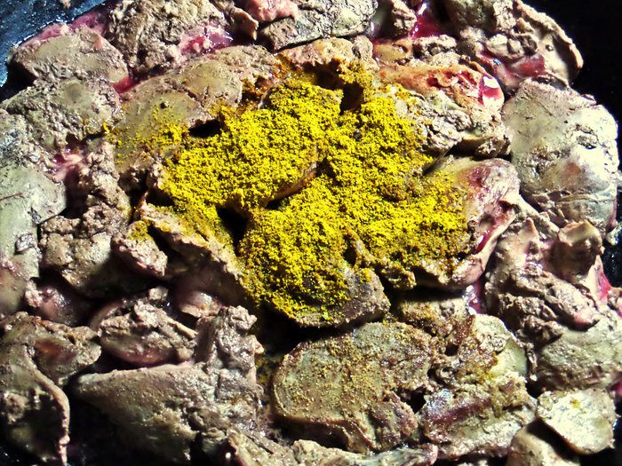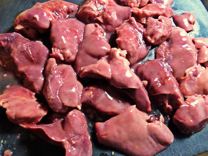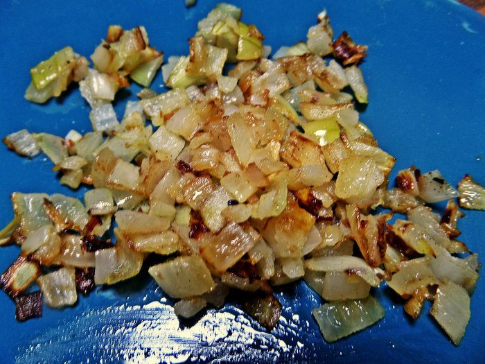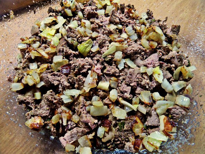 На сухари насыпаем печёнку кусочками, сверху — жареный лук.