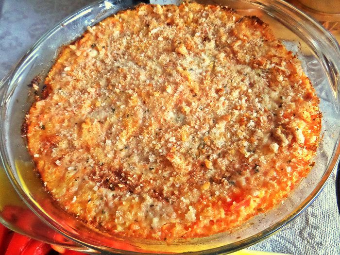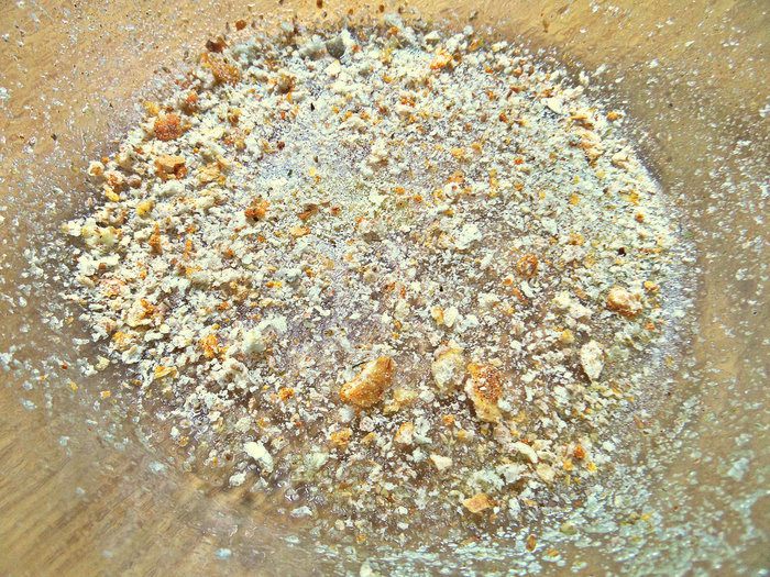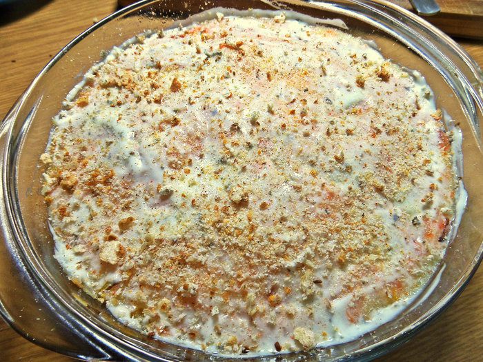 Собираем наше блюдо: смазываем форму для запекания любым маслом и посыпаем дно сухарями. Я использовала стеклянную форму для СВЧ.