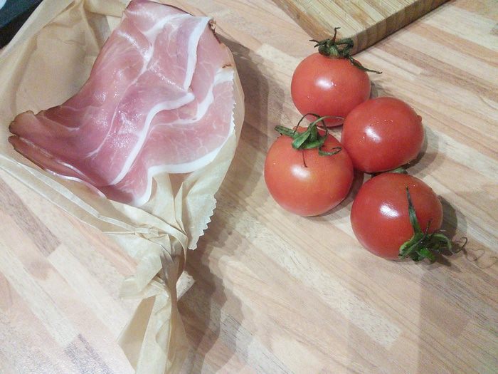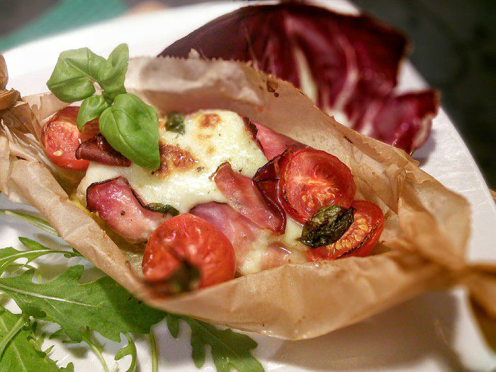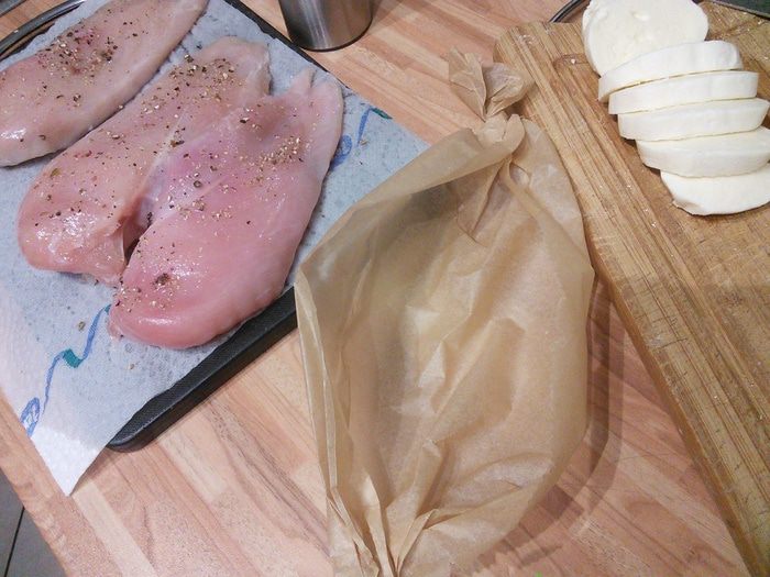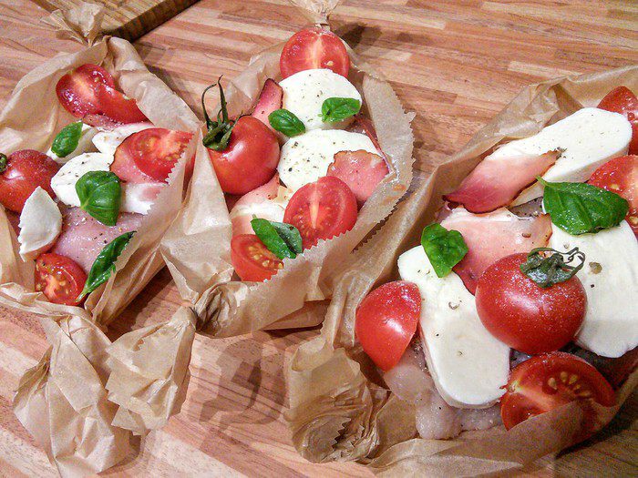 На ветчину выложить куриное филе, по 2-3 кружочка моцареллы, накрыть свисающими концами ветчины, разложить помидорки (если у вас обычные помидоры, то порежьте их на 4 части) и листья базилика. Сверху полить ложечкой хорошего оливкового масла. Ещё раз посолить и поперчить. Если у вас остались полосочки ветчины, разложите её кусочки дополнительно по свободным местам.