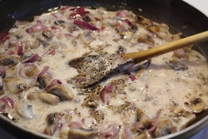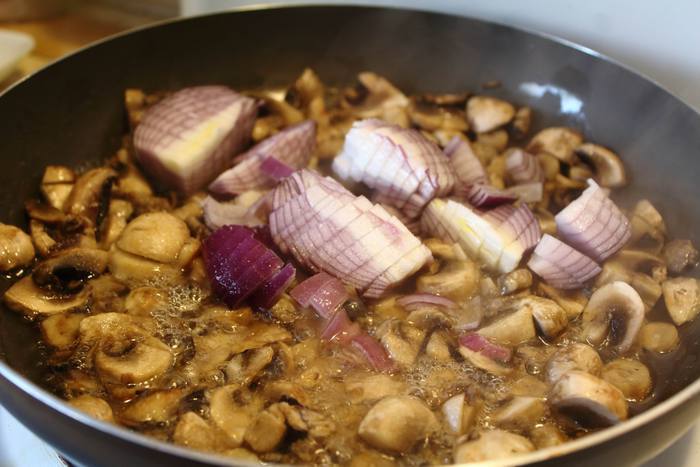 Шампиньоны помыть и порезать на крупные кубики, обжарить их в растительном масле с луком, посолить, поперчить.