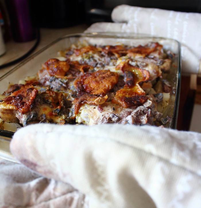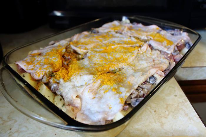 Уложить на картошку с бедрышками тушеные в сметане с луком шампиньоны и укрыть все оставшимися шкурками. Я посыпала куркумой — она придаст корочке красивый цвет. Можно и более классическое решение — посыпать тертым сыром.