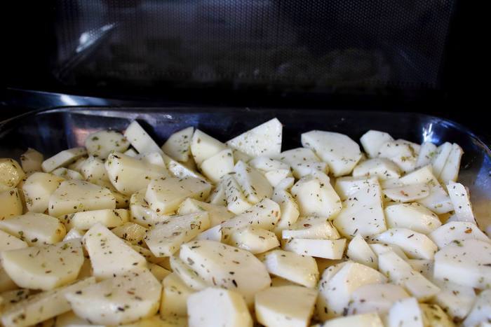 Картофель порезать полукольцами, толщиной около 1 см. Уложить в емкость для выпекания, посолить, поперчить, присыпать травками, полить оливковым маслом и хорошенько ее в этом всем "вывалять" :)