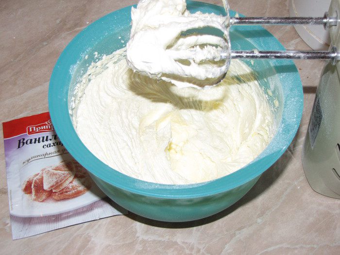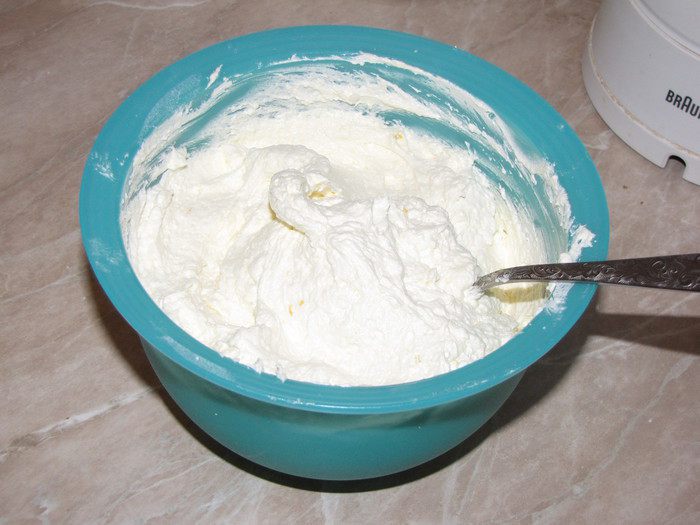 Важно, чтобы в подготовленном для крема твороге совсем не было комочков, тогда и крем получится однородным и пышным.